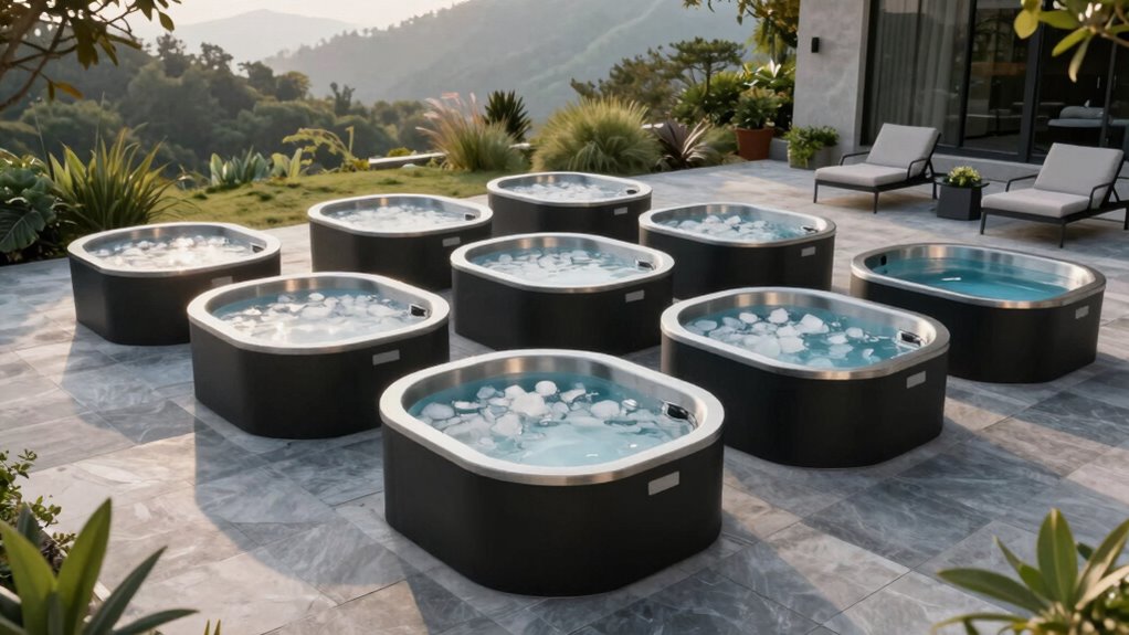 If you’re often on the move or have limited space, portability and storage become top priorities in selecting a cold plunge tub. Portable tubs usually feature inflatable or foldable designs, making them easy to carry and set up wherever you need. Lightweight materials like reinforced PVC, nylon, or inflatable components help reduce weight and allow quick assembly. Many models come with carrying cases or bags, which make transportation and organization simple. The ability to deflate or fold the tub quickly means you can store it in small spaces or pack it for outdoor adventures without hassle. These features guarantee you can enjoy cold plunges wherever your training or recovery takes you, without sacrificing convenience or storage efficiency.