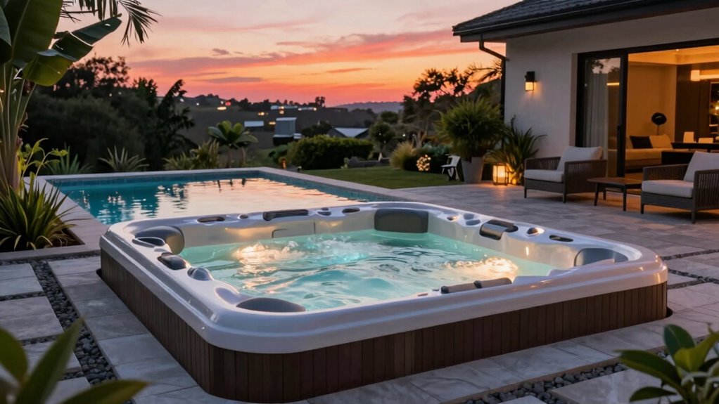 When choosing an outdoor hot tub for your pool patio, paying attention to the massage features and jet placement can greatly enhance your relaxation experience. The number and placement of jets determine the intensity and focus of hydrotherapy, with more jets creating a more immersive massage. Adjustable jets let you customize water pressure and target specific muscle groups, ensuring personalized comfort. Some models offer high-pressure jets that effectively target tight muscles, providing deeper relief. Air jets, combined with water jets, add a gentle, bubbling massage that can soothe and relax. It’s also important to contemplate how jets are positioned relative to seating arrangements, so everyone can enjoy targeted hydrotherapy. Thoughtful jet placement and options make your hot tub a tailored retreat for ultimate relaxation.