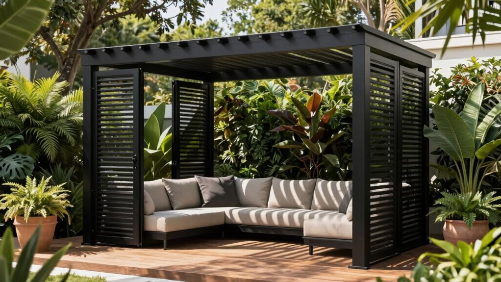 Choosing a premium pergola with adjustable louvers means prioritizing materials that can withstand the elements and last for years. High-quality pergolas are usually made from durable materials like aluminum or galvanized steel, which resist weathering over time. A powder-coated finish on metal frames adds extra protection against rust, UV damage, and corrosion, notably extending the pergola’s lifespan. Reinforced columns and support beams are vital, especially in areas prone to high winds or heavy snow, guaranteeing stability and durability. Additionally, a well-designed drainage system with concealed gutters helps prevent water accumulation, protecting the structure’s integrity. Regular maintenance, like cleaning and inspecting for corrosion or damage, is necessary to keep the pergola in top condition and guarantee it remains a lasting feature in your outdoor space.