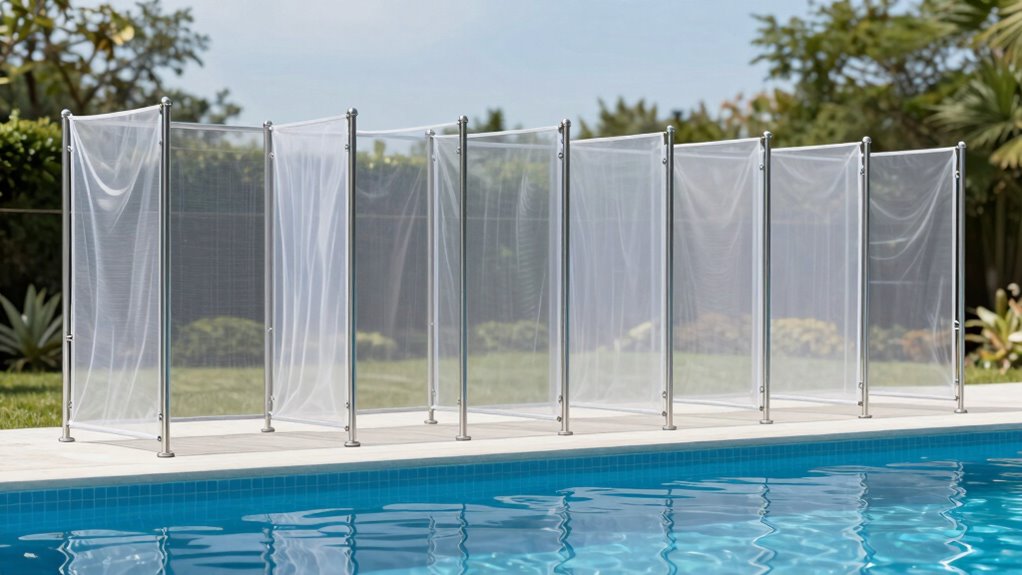 When selecting a removable mesh pool fence, it’s important to think about how well it can withstand the weather conditions in your area. I look for fences made with UV-protected materials to prevent sun damage over time. Weatherproof options like aluminum and stainless steel are essential, as they resist rust and corrosion, even in humid or rainy environments. The mesh fabric should be waterproof and resistant to oils, acids, and alkalis, guaranteeing durability against varying weather elements. I also prioritize fences with sturdy frames that can handle wind, rain, and temperature swings without warping or breaking. Sealed joints and reinforced stitching further guarantee the fence maintains its integrity, no matter what harsh weather conditions it faces.
