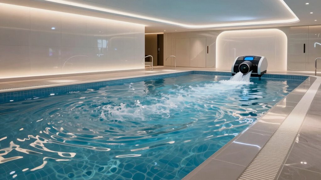 Safety features are thoughtfully integrated into current swim machines, providing peace of mind without feeling heavy-handed. You’ll find anti-slip surfaces, emergency stop buttons, and automatic shut-off systems that kick in if something seems off. These subtle yet effective measures guarantee your swim experience is both enjoyable and secure. I appreciate how these innovations let me focus on my swim, knowing safety is a priority built right into the design.